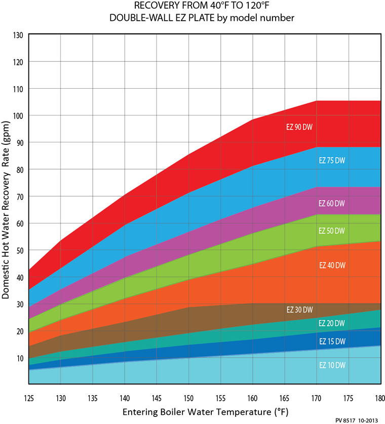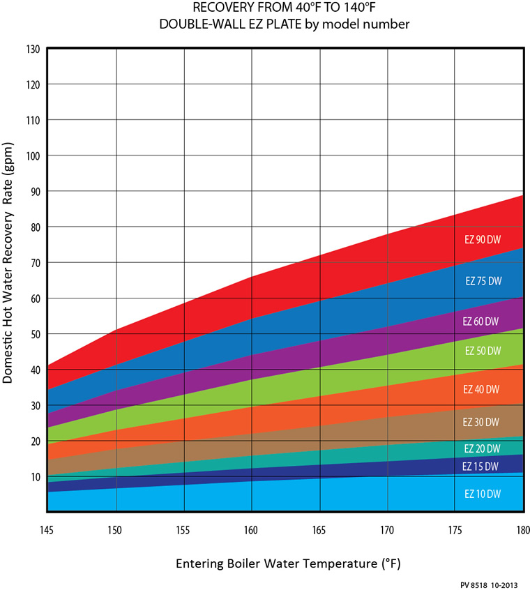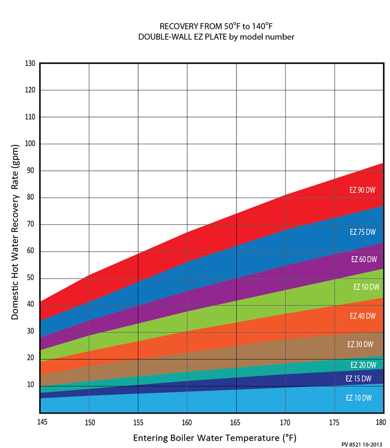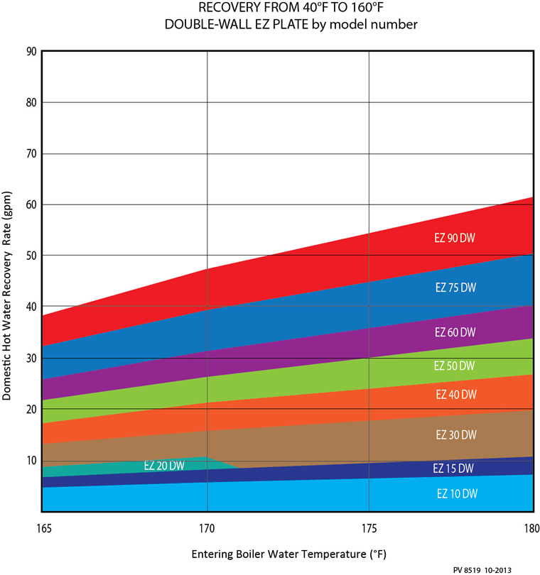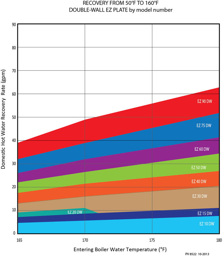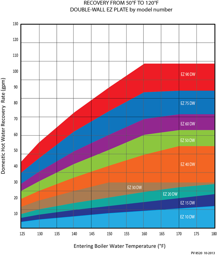 EZ Plate® Instantaneous is a factory piped, skid-mounted water heater that uses high or low temperature boiler water as the energy source. The heat exchanger is double-wall, brazed plate. Temperature control is provided entirely on the domestic water side through a thermostatic mixing valve. This valve modulates infinitely in response to hot water demand. EZ Plate can work with all types of boilers, but especially suited for condensing boilers where low return temperatures are beneficial to the operating efficiency of the system.